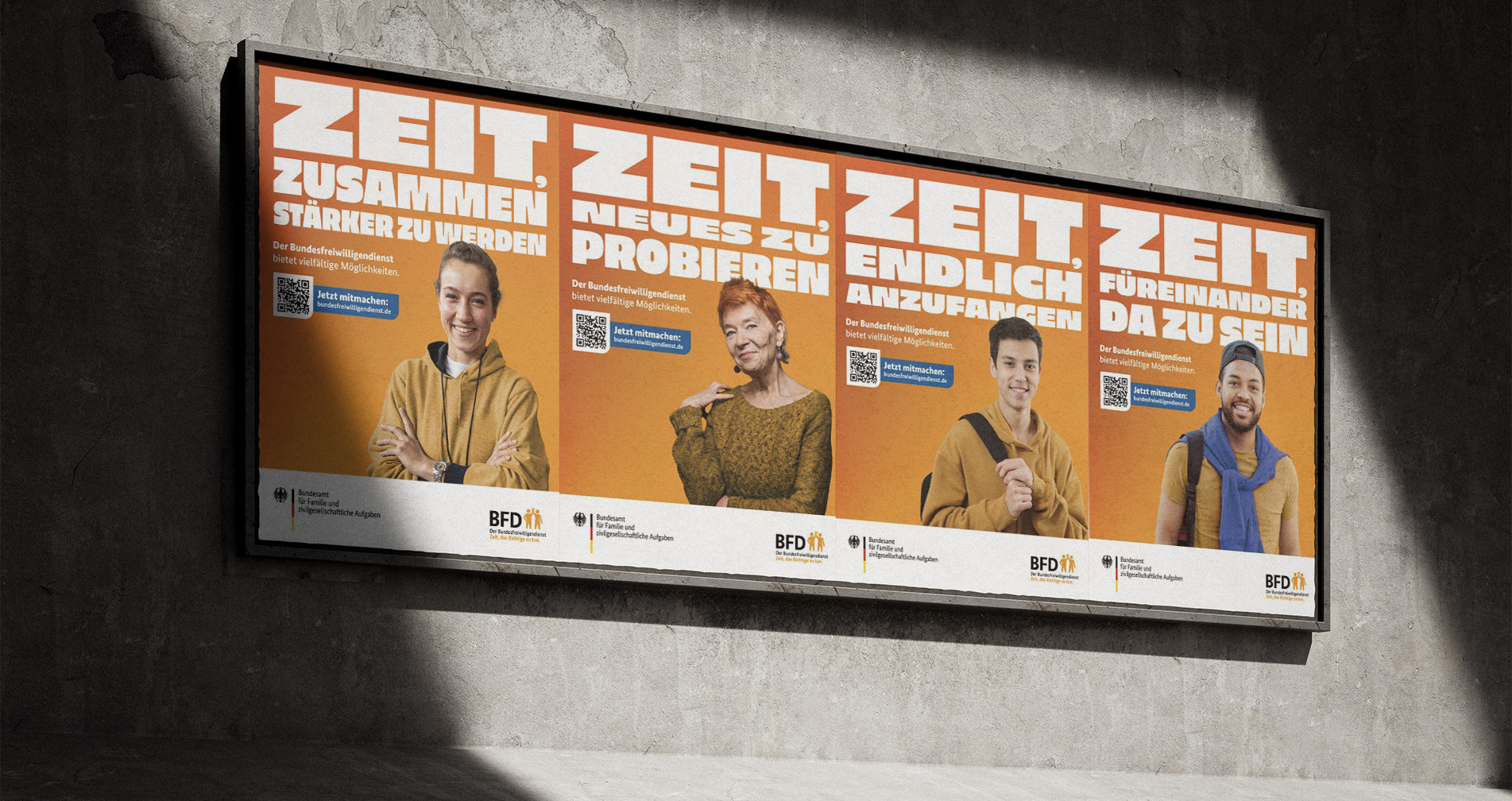We re-conceived the brand and identity of the Bundesfreiwilligendienst BFD based on its institutional framework: as an initiative of the Federal Office for Family and Civil Society Functions BAFzA within the remit of the Federal Ministry for Family Affairs, Senior Citizens, Women and Youth. The goal was to preserve governmental credibility and reliability while at the same time developing an independent, contemporary identity that creates closeness, motivates, and emotionally connects with diverse target groups. The BFD was to remain clearly recognizable as a state-supported program, yet expressed through a tone and attitude that present voluntary service as a personal opportunity and a meaningful contribution to society.