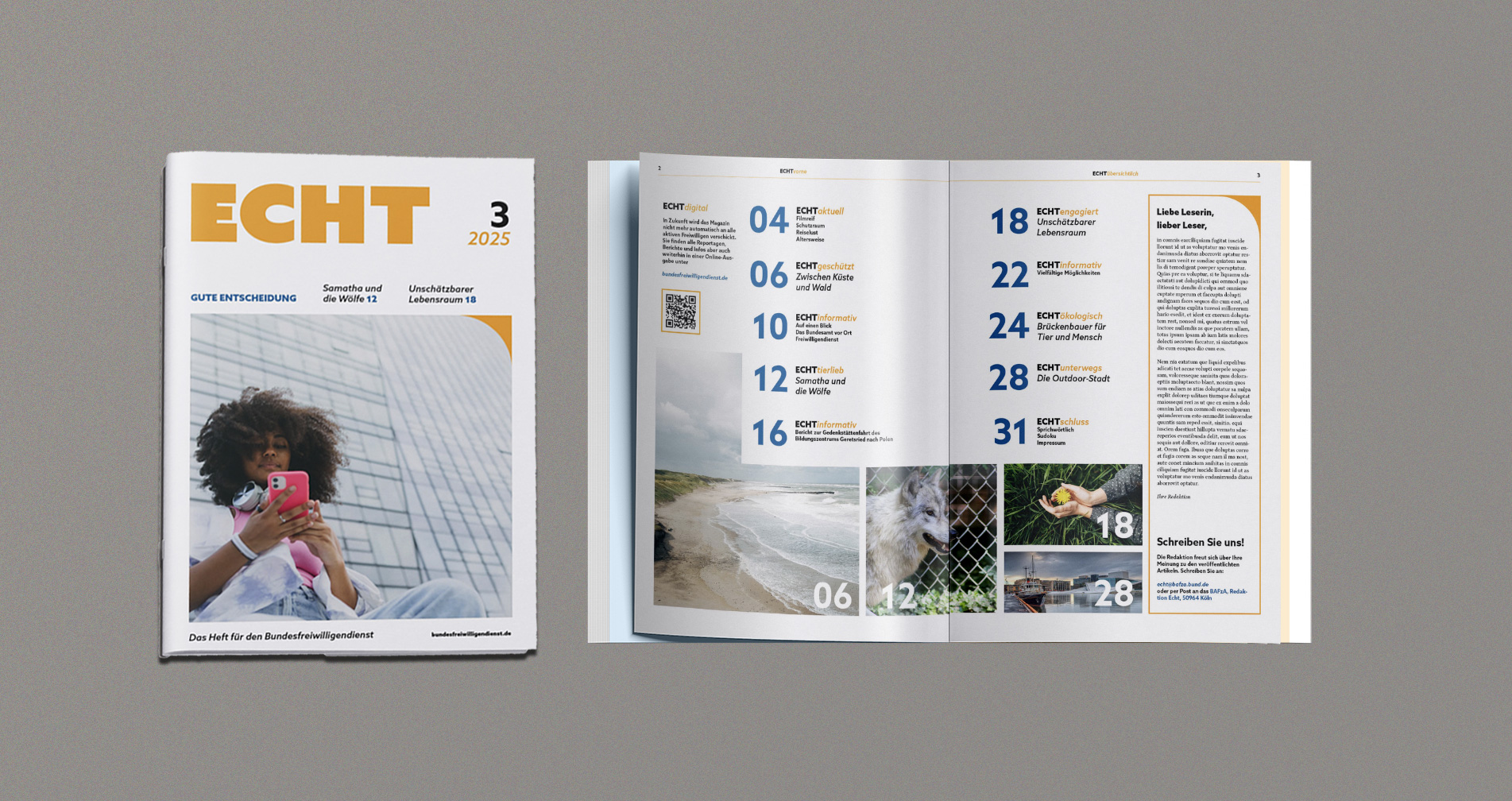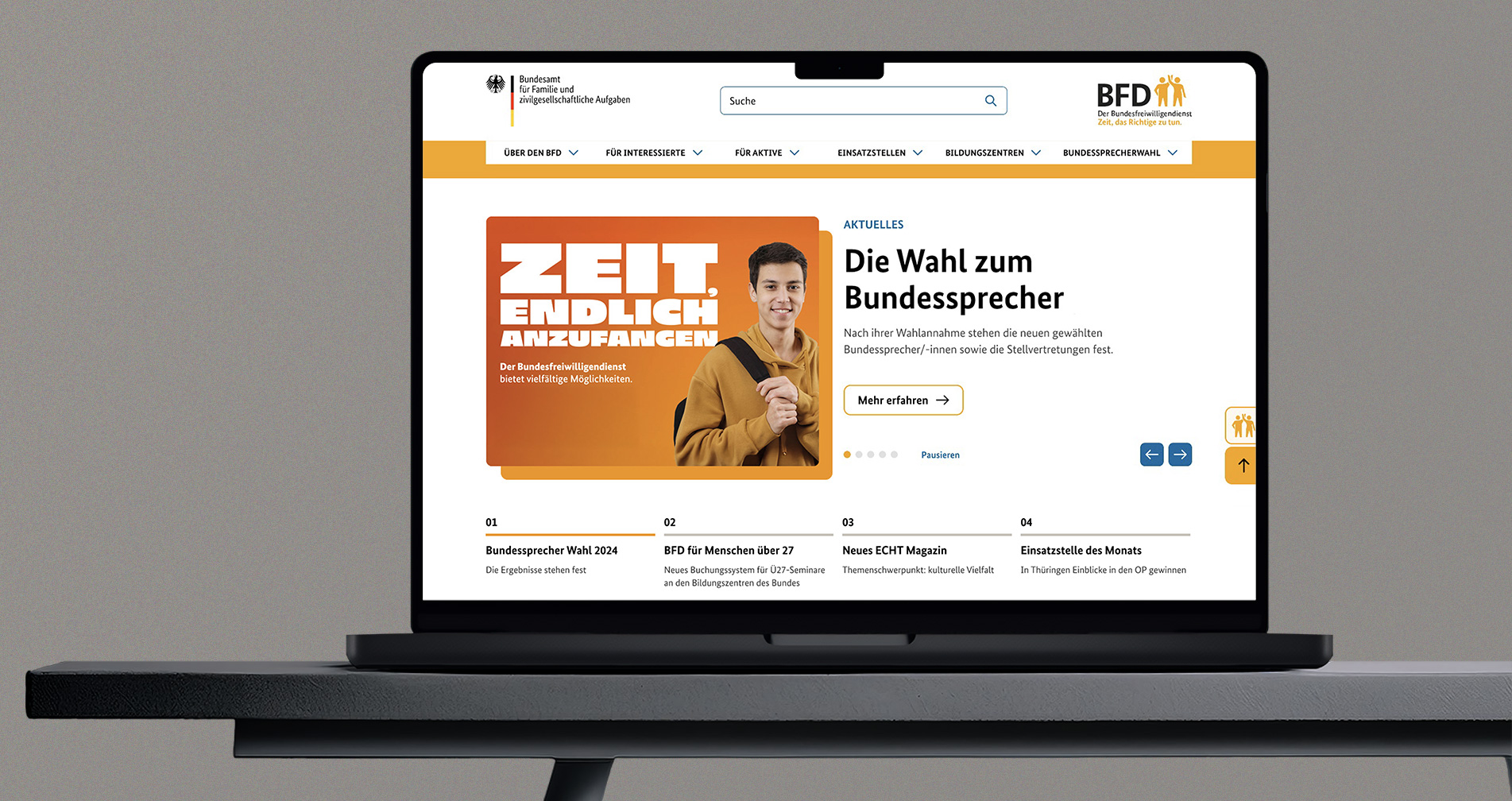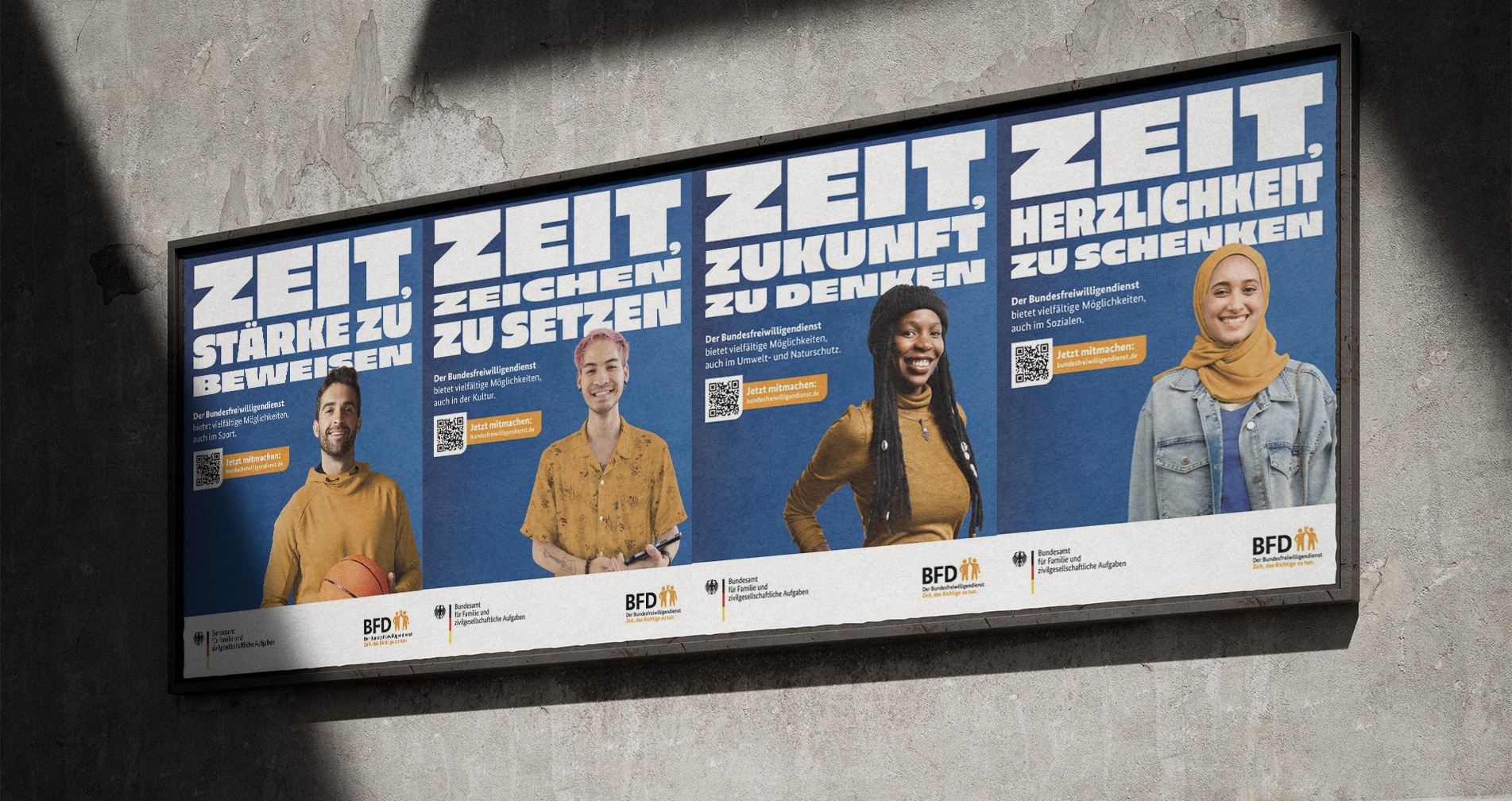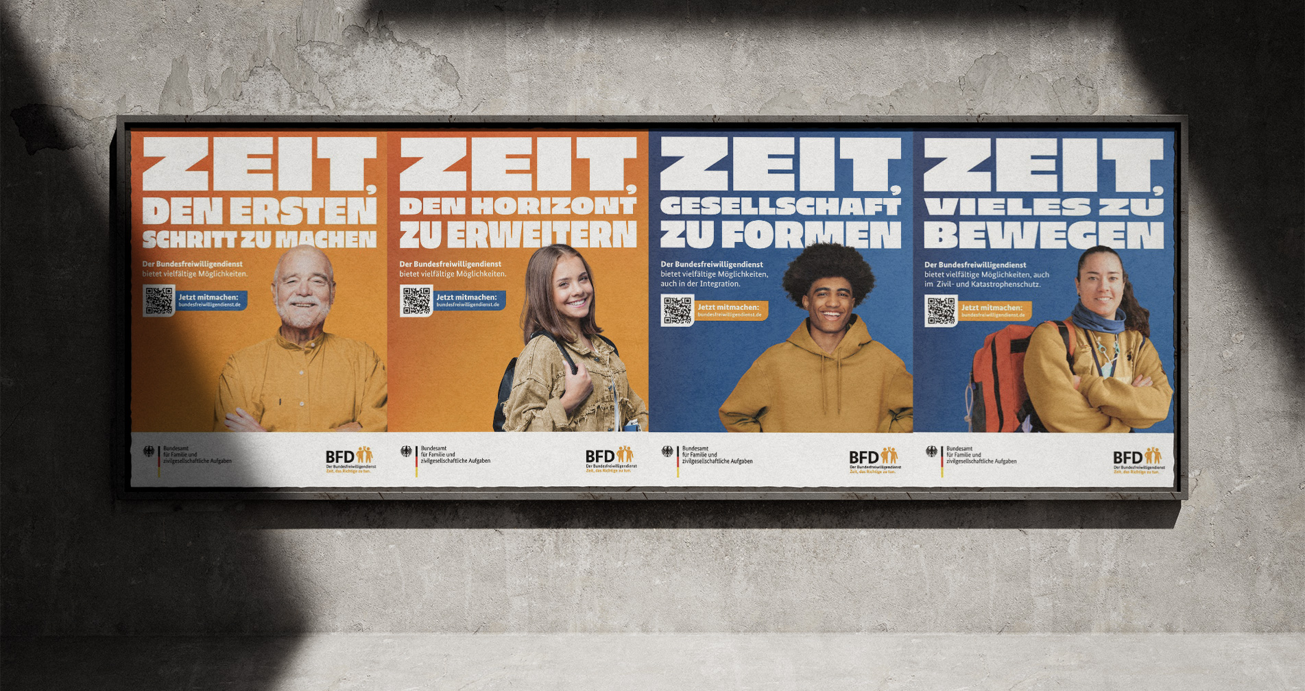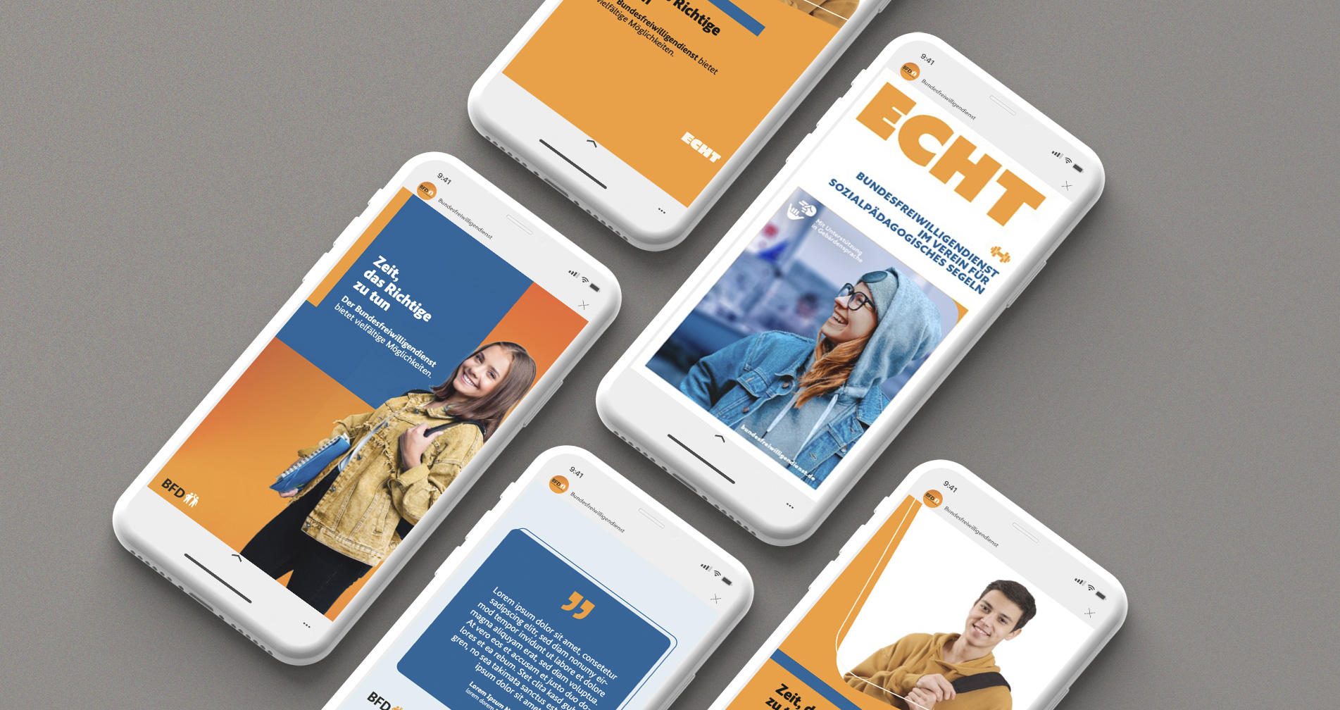 We re-conceived the brand and identity of the Bundesfreiwilligendienst BFD based on its institutional framework: as an initiative of the Federal Office for Family and Civil Society Functions BAFzA within the remit of the Federal Ministry for Family Affairs, Senior Citizens, Women and Youth. The goal was to preserve governmental credibility and reliability while at the same time developing an independent, contemporary identity that creates closeness, motivates, and emotionally connects with diverse target groups. The BFD was to remain clearly recognizable as a state-supported program, yet expressed through a tone and attitude that present voluntary service as a personal opportunity and a meaningful contribution to society.